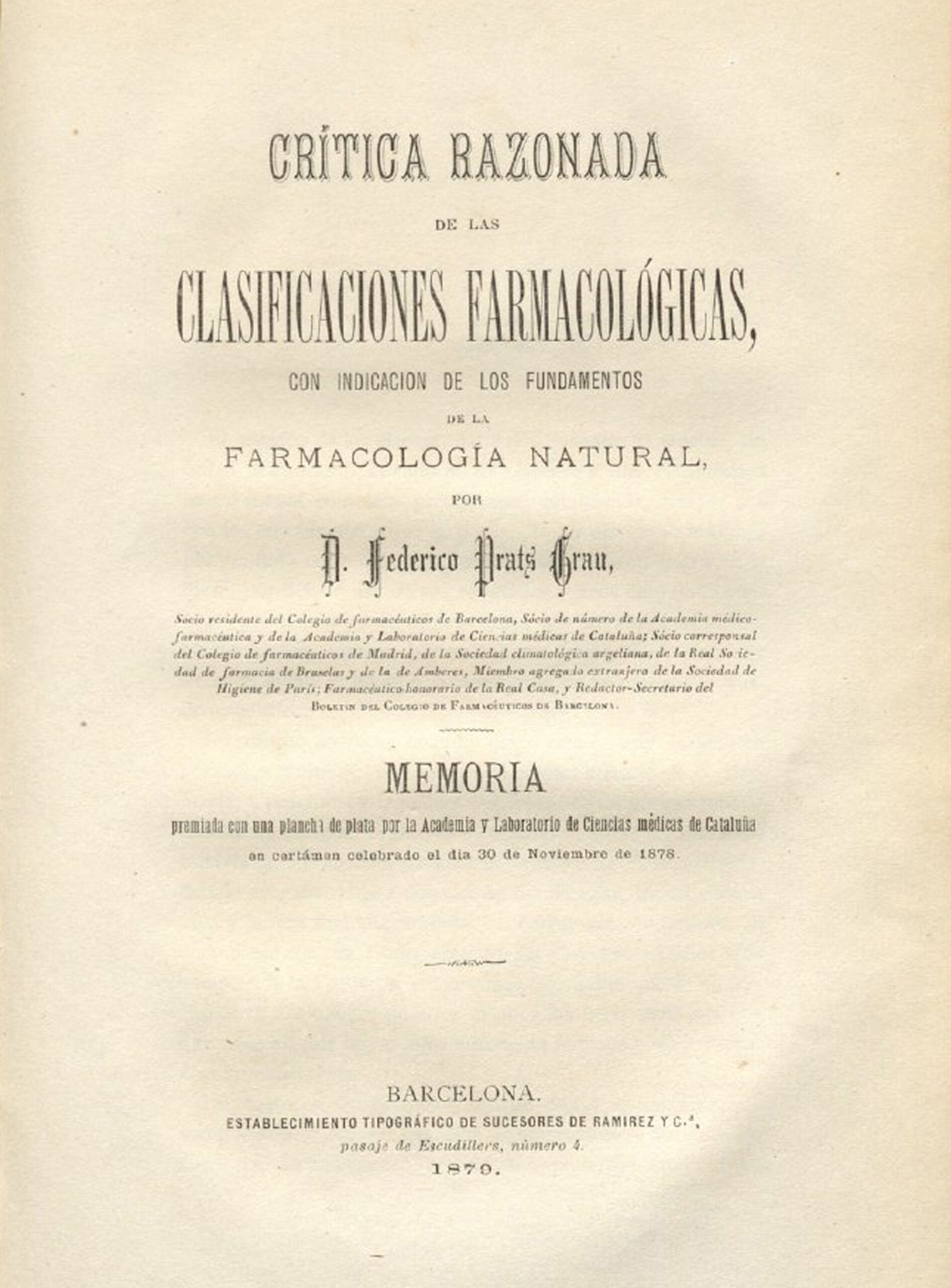 Crítica razonada de las clasificaciones farmacológicas con indicación de los fundamentos de la Farmacología natural. Memoria premiada… por la Academia y Laboratorio de Ciencias Médicas de Cataluña