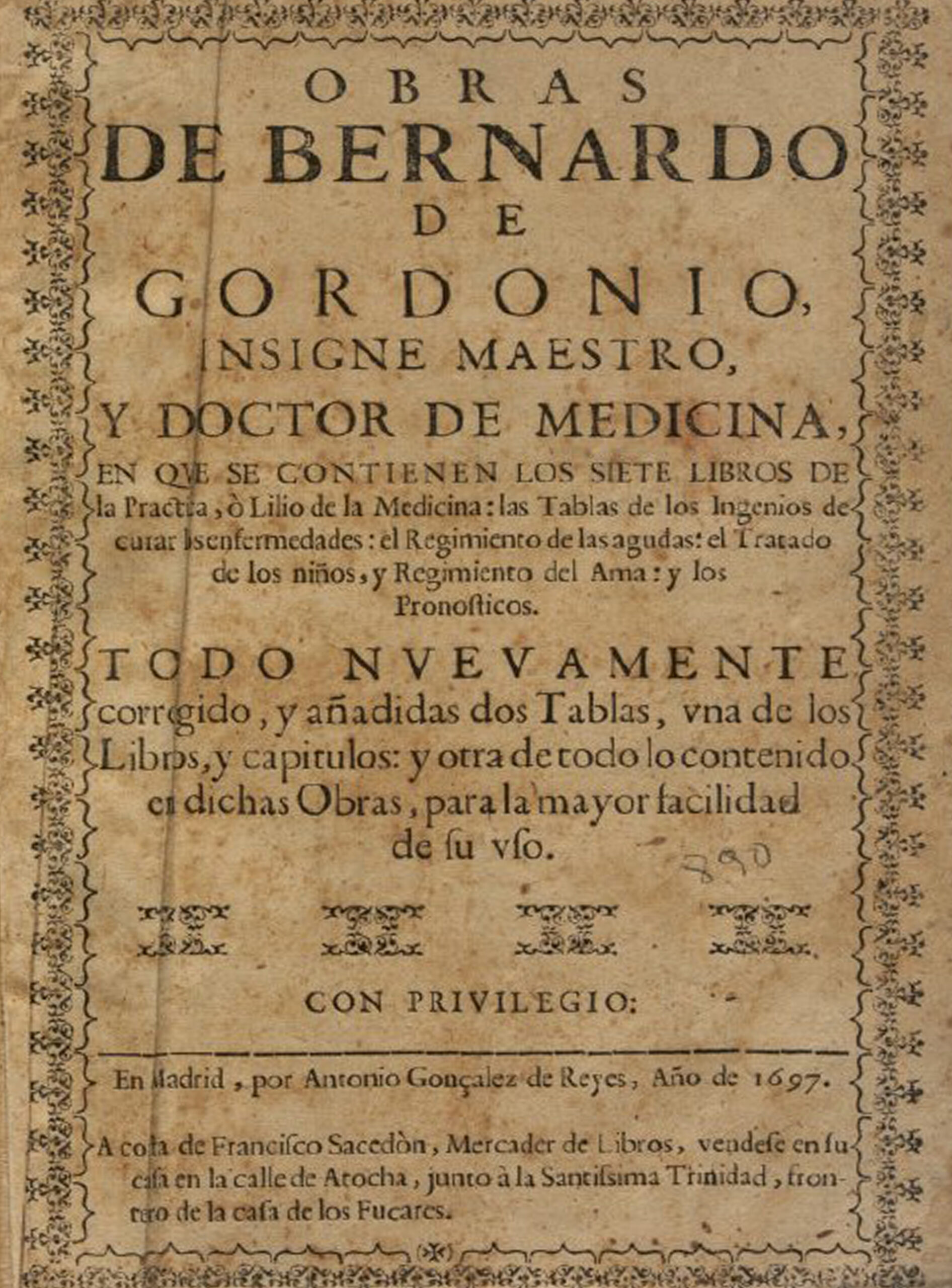 Obras de Bernardo de Gordonio en que se contienen los siete libros de la practica, o Lilio de la medicina: las tablas de los ingenios de curar las enfermedades…