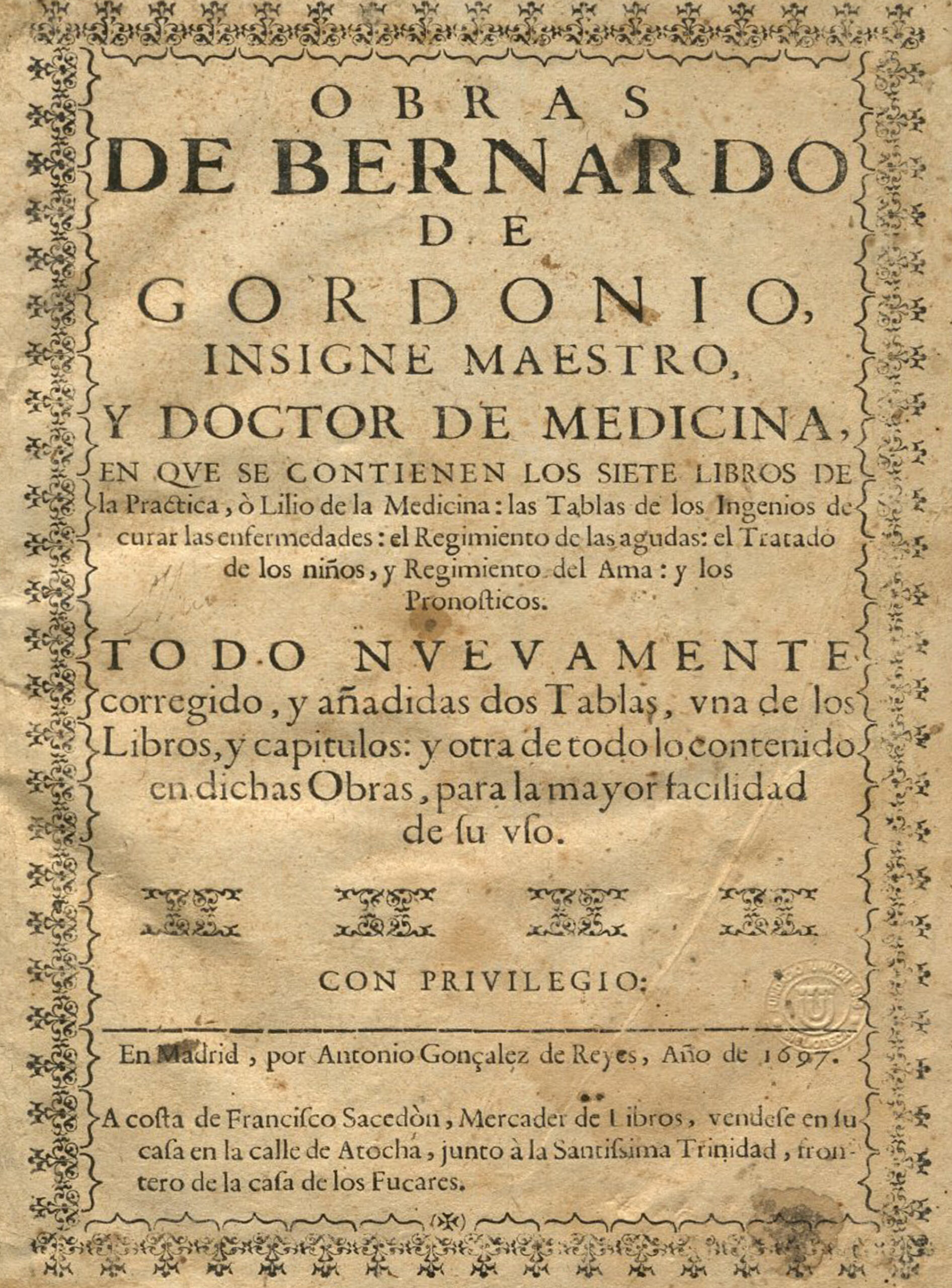 Obras de Bernardo de Gordonio en que se contienen los siete libros de la practica, o Lilio de la medicina: las tablas de los ingenios de curar las enfermedades: el regimiento de las agudas: el tratado de los niños, y regimiento del ama: y los pronósticos.