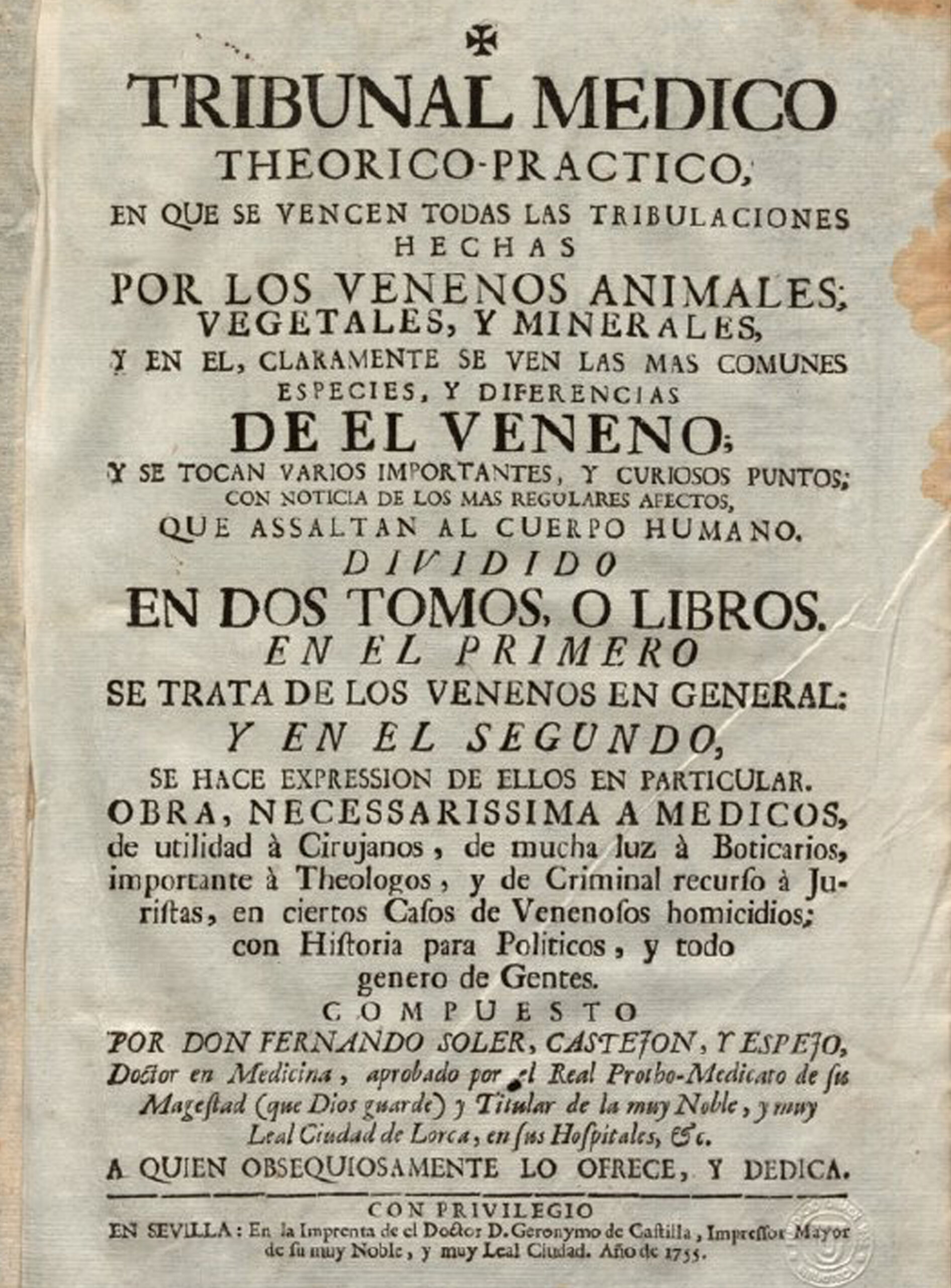 Tribunal medico theorico-practico, en que se vencen todas las tribulaciones hechas por los venenos animales, vegetales y minerales, y en el claramente se ven las mas comunes especies, y diferencias del veneno …