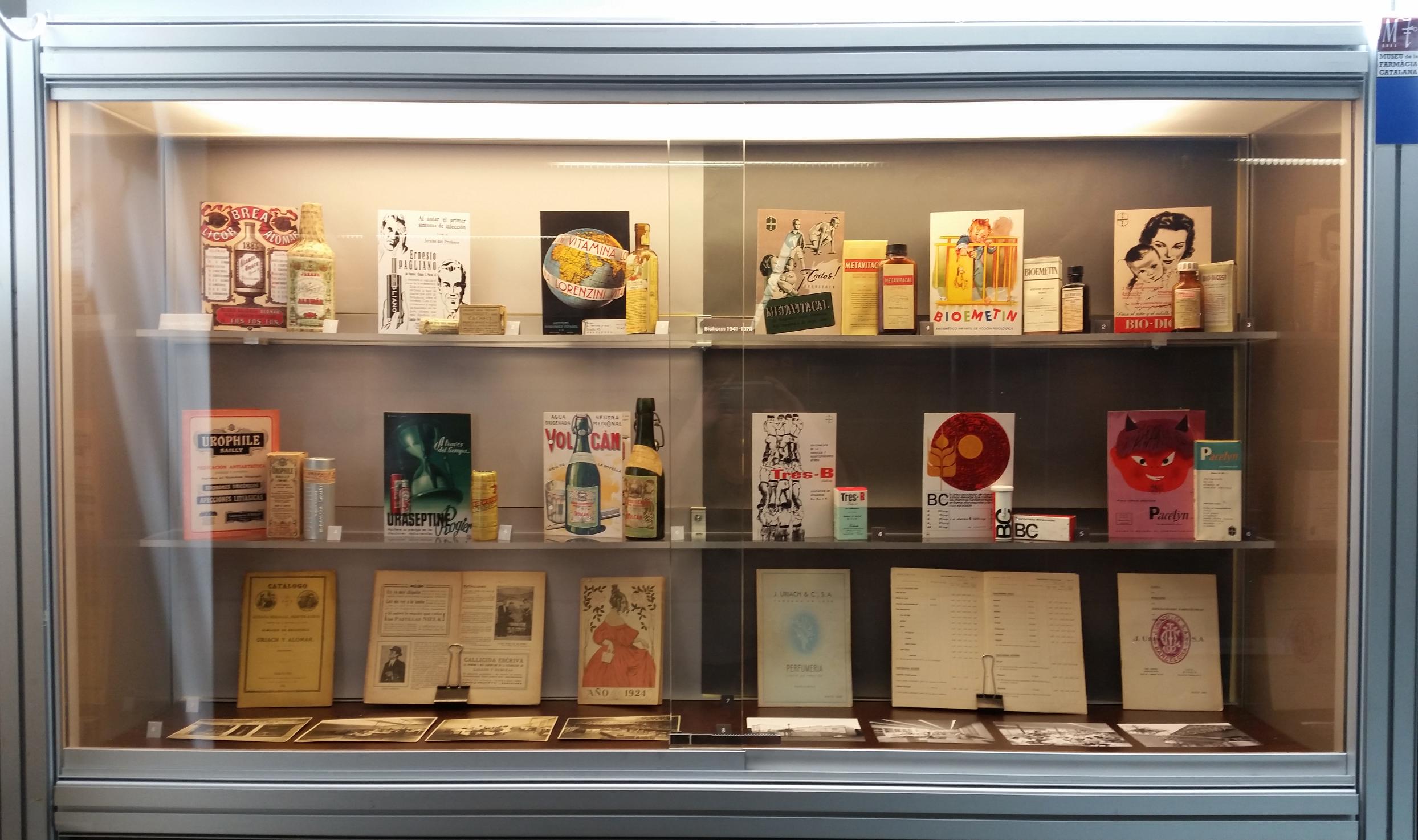 Among the materials on display are a collection of large format advertisements from the late 19th century, various medicines produced or distributed by Uriach, several objects used for healing, as well as different publications and product catalogues.